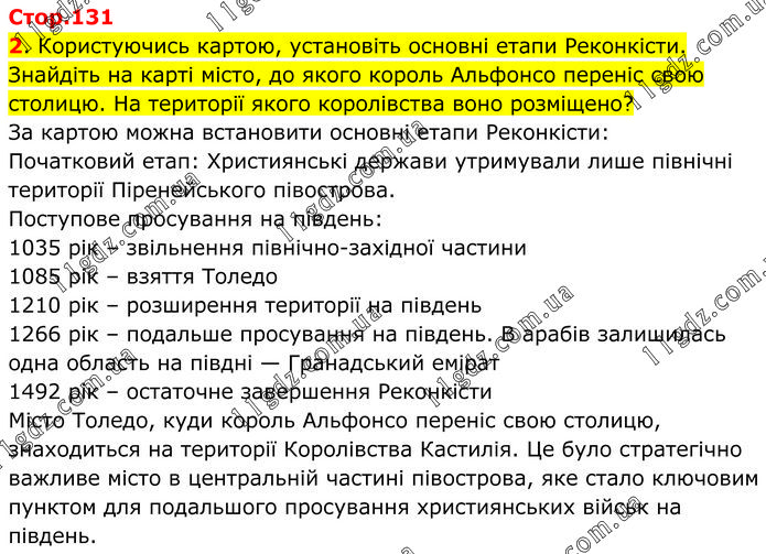 2. Користуючись картою, установіть основні етапи Реконкісти. Знайдіть на карті місто, до якого король Альфонсо переніс свою столицю. На території якого королівства воно розміщено? За картою можна встановити основні етапи Реконкісти: Початковий етап: Християнські держави утримували лише північні території Піренейського півострова. Поступове просування на південь: 1035 рік – звільнення північно-західної частини 1085 рік – взяття Толедо 1210 рік – розширення території на південь 1266 рік – подальше просування на південь. В арабів залишилась одна область на півдні — Гранадський емірат 1492 рік – остаточне завершення Реконкісти Місто Толедо, куди король Альфонсо переніс свою столицю, знаходиться на території Королівства Кастилія. Це було стратегічно важливе місто в центральній частині півострова, яке стало ключовим пунктом для подальшого просування християнських військ на південь.