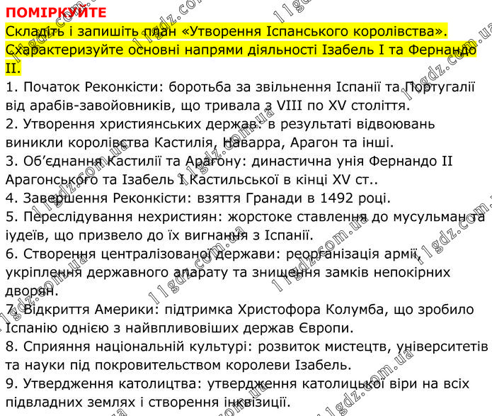 ПОМІРКУЙТЕ Складіть і запишіть план «Утворення Іспанського королівства». Схарактеризуйте основні напрями діяльності Ізабель І та Фернандо ІІ. 1. Початок Реконкісти: боротьба за звільнення Іспанії та Португалії від арабів-завойовників, що тривала з VIII по XV століття. 2. Утворення християнських держав: в результаті відвоювань виникли королівства Кастилія, Наварра, Арагон та інші. 3. Об’єднання Кастилії та Арагону: династична унія Фернандо ІІ Арагонського та Ізабель І Кастильської в кінці ХV ст.. 4. Завершення Реконкісти: взяття Гранади в 1492 році. 5. Переслідування нехристиян: жорстоке ставлення до мусульман та іудеїв, що призвело до їх вигнання з Іспанії. 6. Створення централізованої держави: реорганізація армії, укріплення державного апарату та знищення замків непокірних дворян. 7. Відкриття Америки: підтримка Христофора Колумба, що зробило Іспанію однією з найвпливовіших держав Європи. 8. Сприяння національній культурі: розвиток мистецтв, університетів та науки під покровительством королеви Ізабель. 9. Утвердження католицтва: утвердження католицької віри на всіх підвладних землях і створення інквізиції.