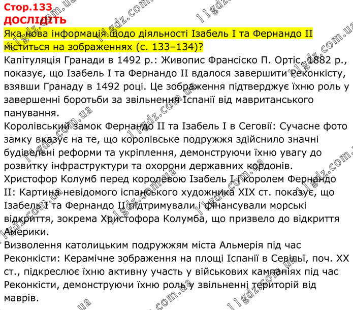 ДОСЛІДІТЬ Яка нова інформація щодо діяльності Ізабель І та Фернандо ІІ міститься на зображеннях (с. 133–134)? Капітуляція Гранади в 1492 р.: Живопис Франсіско П. Ортіс, 1882 р., показує, що Ізабель І та Фернандо ІІ вдалося завершити Реконкісту, взявши Гранаду в 1492 році. Це зображення підтверджує їхню роль у завершенні боротьби за звільнення Іспанії від мавританського панування. Королівський замок Фернандо ІІ та Ізабель І в Сеговії: Сучасне фото замку вказує на те, що королівське подружжя здійснило значні будівельні реформи та укріплення, демонструючи їхню увагу до розвитку інфраструктури та охорони державних кордонів. Христофор Колумб перед королевою Ізабель І і королем Фернандо ІІ: Картина невідомого іспанського художника XIX ст. показує, що Ізабель І та Фернандо ІІ підтримували і фінансували морські відкриття, зокрема Христофора Колумба, що призвело до відкриття Америки. Визволення католицьким подружжям міста Альмерія під час Реконкісти: Керамічне зображення на площі Іспанії в Севільї, поч. ХХ ст., підкреслює їхню активну участь у військових кампаніях під час Реконкісти, демонструючи їхню роль у звільненні територій від маврів.