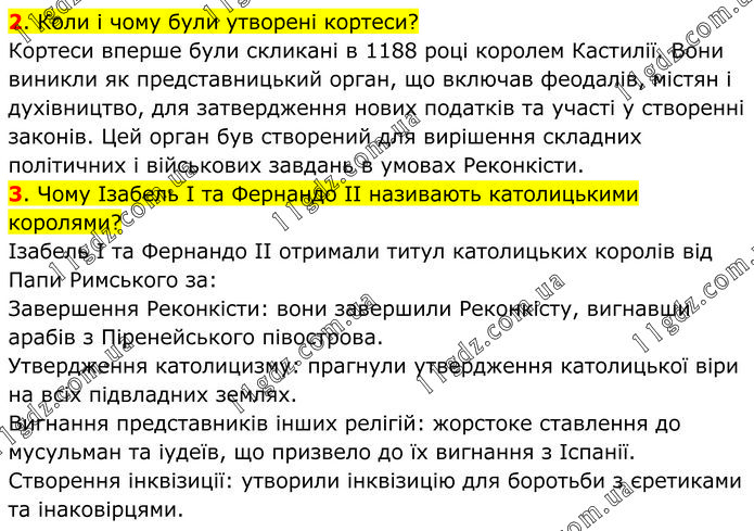 2. Коли і чому були утворені кортеси? Кортеси вперше були скликані в 1188 році королем Кастилії. Вони виникли як представницький орган, що включав феодалів, містян і духівництво, для затвердження нових податків та участі у створенні законів. Цей орган був створений для вирішення складних політичних і військових завдань в умовах Реконкісти. 3. Чому Ізабель І та Фернандо ІІ називають католицькими королями? Ізабель І та Фернандо ІІ отримали титул католицьких королів від Папи Римського за: Завершення Реконкісти: вони завершили Реконкісту, вигнавши арабів з Піренейського півострова. Утвердження католицизму: прагнули утвердження католицької віри на всіх підвладних землях. Вигнання представників інших релігій: жорстоке ставлення до мусульман та іудеїв, що призвело до їх вигнання з Іспанії. Створення інквізиції: утворили інквізицію для боротьби з єретиками та інаковірцями.