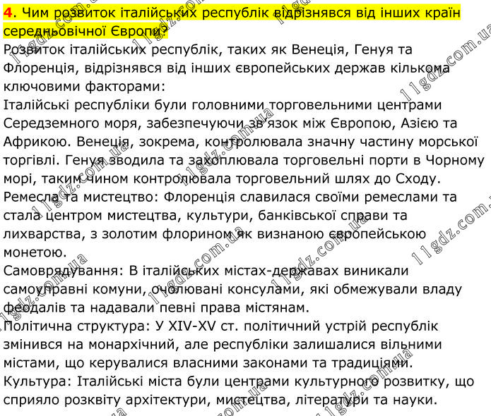 Чим розвиток італійських республік відрізнявся від інших країн середньовічної Європи? Розвиток італійських республік, таких як Венеція, Генуя та Флоренція, відрізнявся від інших європейських держав кількома ключовими факторами: Італійські республіки були головними торговельними центрами Середземного моря, забезпечуючи зв’язок між Європою, Азією та Африкою. Венеція, зокрема, контролювала значну частину морської торгівлі. Генуя зводила та захоплювала торговельні порти в Чорному морі, таким чином контролювала торговельний шлях до Сходу. Ремесла та мистецтво: Флоренція славилася своїми ремеслами та стала центром мистецтва, культури, банківської справи та лихварства, з золотим флорином як визнаною європейською монетою. Самоврядування: В італійських містах-державах виникали самоуправні комуни, очолювані консулами, які обмежували владу феодалів та надавали певні права містянам. Політична структура: У XIV-XV ст. політичний устрій республік змінився на монархічний, але республіки залишалися вільними містами, що керувалися власними законами та традиціями. Культура: Італійські міста були центрами культурного розвитку, що сприяло розквіту архітектури, мистецтва, літератури та науки.