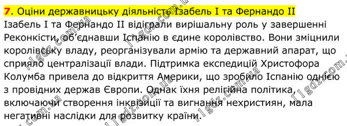 Оціни державницьку діяльність Ізабель І та Фернандо ІІ Ізабель І та Фернандо ІІ відіграли вирішальну роль у завершенні Реконкісти, об’єднавши Іспанію в єдине королівство. Вони зміцнили королівську владу, реорганізували армію та державний апарат, що сприяло централізації влади. Підтримка експедицій Христофора Колумба привела до відкриття Америки, що зробило Іспанію однією з провідних держав Європи. Однак їхня релігійна політика, включаючи створення інквізиції та вигнання нехристиян, мала негативні наслідки для розвитку країни.