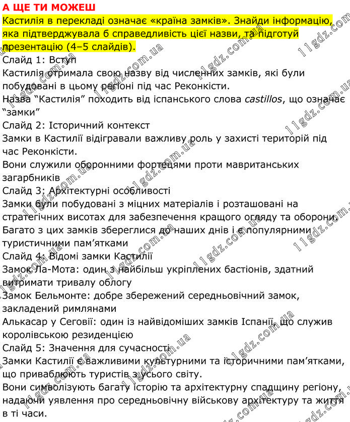 А ЩЕ ТИ МОЖЕШ Кастилія в перекладі означає «країна замків». Знайди інформацію, яка підтверджувала б справедливість цієї назви, та підготуй презентацію (4–5 слайдів). Слайд 1: Вступ Кастилія отримала свою назву від численних замків, які були побудовані в цьому регіоні під час Реконкісти. Назва “Кастилія” походить від іспанського слова castillos, що означає “замки” Слайд 2: Історичний контекст Замки в Кастилії відігравали важливу роль у захисті територій під час Реконкісти. Вони служили оборонними фортецями проти мавританських загарбників Слайд 3: Архітектурні особливості Замки були побудовані з міцних матеріалів і розташовані на стратегічних висотах для забезпечення кращого огляду та оборони. Багато з цих замків збереглися до наших днів і є популярними туристичними пам’ятками Слайд 4: Відомі замки Кастилії Замок Ла-Мота: один з найбільш укріплених бастіонів, здатний витримати тривалу облогу Замок Бельмонте: добре збережений середньовічний замок, закладений римлянами Алькасар у Сеговії: один із найвідоміших замків Іспанії, що служив королівською резиденцією Слайд 5: Значення для сучасності Замки Кастилії є важливими культурними та історичними пам’ятками, що приваблюють туристів з усього світу. Вони символізують багату історію та архітектурну спадщину регіону, надаючи уявлення про середньовічну військову архітектуру та життя в ті часи.