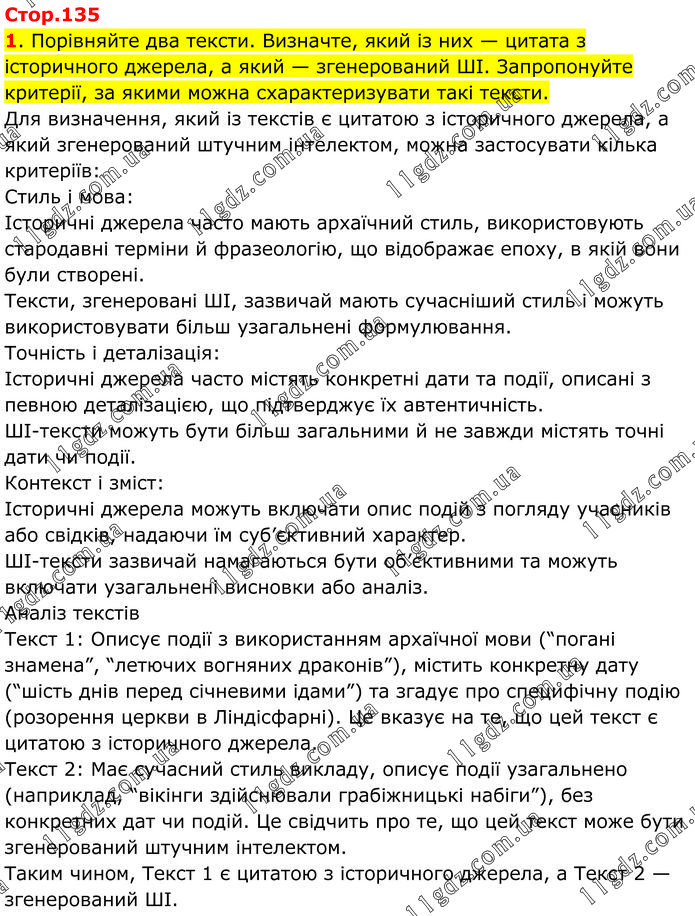 Порівняйте два тексти. Визначте, який із них — цитата з історичного джерела, а який — згенерований ШІ. Запропонуйте критерії, за якими можна схарактеризувати такі тексти. Для визначення, який із текстів є цитатою з історичного джерела, а який згенерований штучним інтелектом, можна застосувати кілька критеріїв: Стиль і мова: Історичні джерела часто мають архаїчний стиль, використовують стародавні терміни й фразеологію, що відображає епоху, в якій вони були створені. Тексти, згенеровані ШІ, зазвичай мають сучасніший стиль і можуть використовувати більш узагальнені формулювання. Точність і деталізація: Історичні джерела часто містять конкретні дати та події, описані з певною деталізацією, що підтверджує їх автентичність. ШІ-тексти можуть бути більш загальними й не завжди містять точні дати чи події. Контекст і зміст: Історичні джерела можуть включати опис подій з погляду учасників або свідків, надаючи їм суб’єктивний характер. ШІ-тексти зазвичай намагаються бути об’єктивними та можуть включати узагальнені висновки або аналіз. Аналіз текстів Текст 1: Описує події з використанням архаїчної мови (“погані знамена”, “летючих вогняних драконів”), містить конкретну дату (“шість днів перед січневими ідами”) та згадує про специфічну подію (розорення церкви в Ліндісфарні). Це вказує на те, що цей текст є цитатою з історичного джерела. Текст 2: Має сучасний стиль викладу, описує події узагальнено (наприклад, “вікінги здійснювали грабіжницькі набіги”), без конкретних дат чи подій. Це свідчить про те, що цей текст може бути згенерований штучним інтелектом. Таким чином, Текст 1 є цитатою з історичного джерела, а Текст 2 — згенерований ШІ.