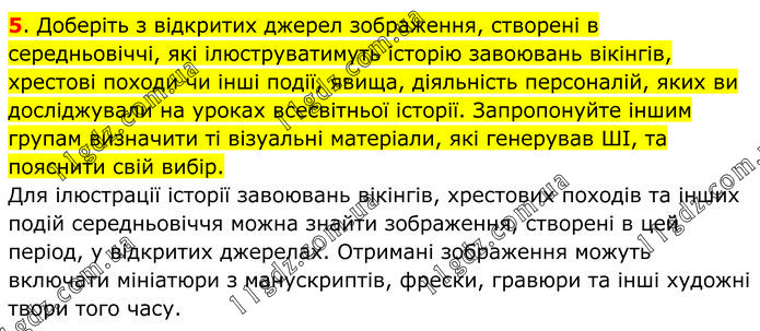 Доберіть з відкритих джерел зображення, створені в середньовіччі, які ілюструватимуть історію завоювань вікінгів, хрестові походи чи інші події, явища, діяльність персоналій, яких ви досліджували на уроках всесвітньої історії. Запропонуйте іншим групам визначити ті візуальні матеріали, які генерував ШІ, та пояснити свій вибір. Для ілюстрації історії завоювань вікінгів, хрестових походів та інших подій середньовіччя можна знайти зображення, створені в цей період, у відкритих джерелах. Отримані зображення можуть включати мініатюри з манускриптів, фрески, гравюри та інші художні твори того часу.