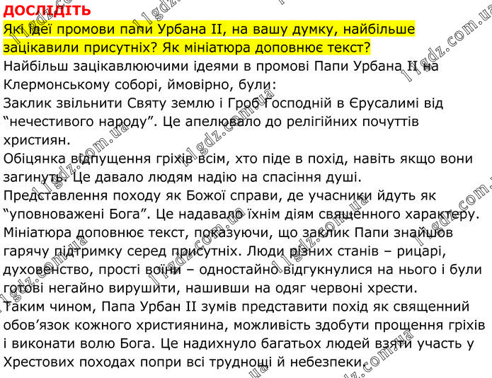 ДОСЛІДІТЬ Які ідеї промови папи Урбана II, на вашу думку, найбільше зацікавили присутніх? Як мініатюра доповнює текст? Найбільш зацікавлюючими ідеями в промові Папи Урбана II на Клермонському соборі, ймовірно, були: Заклик звільнити Святу землю і Гроб Господній в Єрусалимі від “нечестивого народу”. Це апелювало до релігійних почуттів християн. Обіцянка відпущення гріхів всім, хто піде в похід, навіть якщо вони загинуть. Це давало людям надію на спасіння душі. Представлення походу як Божої справи, де учасники йдуть як “уповноважені Бога”. Це надавало їхнім діям священного характеру. Мініатюра доповнює текст, показуючи, що заклик Папи знайшов гарячу підтримку серед присутніх. Люди різних станів – рицарі, духовенство, прості воїни – одностайно відгукнулися на нього і були готові негайно вирушити, нашивши на одяг червоні хрести. Таким чином, Папа Урбан II зумів представити похід як священний обов’язок кожного християнина, можливість здобути прощення гріхів і виконати волю Бога. Це надихнуло багатьох людей взяти участь у Хрестових походах попри всі труднощі й небезпеки.