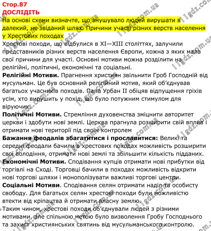 ДОСЛІДІТЬ На основі схеми визначте, що змушувало людей вирушати в далекий, не звіданий шлях. Причини участі різних верств населення у Хрестових походах Хрестові походи, що відбулися в XI—XIII століттях, залучили представників різних верств населення Європи, кожна з яких мала свої причини для участі. Основні мотиви можна розділити на релігійні, політичні, економічні та соціальні. Релігійні Мотиви. Прагнення християн звільнити Гроб Господній від мусульман. Це був основний релігійний мотив, який об’єднував багатьох учасників походів. Папа Урбан II обіцяв відпущення гріхів усім, хто вирушить у похід, що було потужним стимулом для віруючих. Політичні Мотиви. Стремління духовенства зміцнити авторитет церкви і здобути нові землі. Церква прагнула розширити свій вплив і отримати нові території під своїм контролем Бажання феодалів збагатитися і прославитися: Великі та середні феодали бачили в хрестових походах можливість розширити свої володіння, отримати нові землі та збільшити кількість підданих. Економічні Мотиви. Сподівання купців отримати нові прибутки від торгівлі на Сході. Торговці бачили в походах можливість відкрити нові торгові шляхи і монополізувати важливі торгові центри. Соціальні Мотиви. Сподівання селян отримати наділ та особисту свободу. Для багатьох селян хрестові походи були можливістю втекти від кріпацтва й отримати власну землю. Таким чином, хрестові походи об’єднували людей з різними мотивами, але спільною метою було визволення Гробу Господнього та захист християнських святинь від мусульманського контролю.