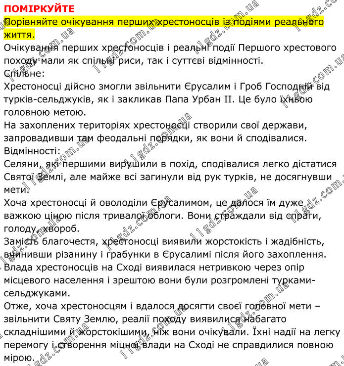 ПОМІРКУЙТЕ Порівняйте очікування перших хрестоносців із подіями реального життя. Очікування перших хрестоносців і реальні події Першого хрестового походу мали як спільні риси, так і суттєві відмінності. Спільне: Хрестоносці дійсно змогли звільнити Єрусалим і Гроб Господній від турків-сельджуків, як і закликав Папа Урбан II. Це було їхньою головною метою. На захоплених територіях хрестоносці створили свої держави, запровадивши там феодальні порядки, як вони й сподівалися. Відмінності: Селяни, які першими вирушили в похід, сподівалися легко дістатися Святої Землі, але майже всі загинули від рук турків, не досягнувши мети. Хоча хрестоносці й оволоділи Єрусалимом, це далося їм дуже важкою ціною після тривалої облоги. Вони страждали від спраги, голоду, хвороб. Замість благочестя, хрестоносці виявили жорстокість і жадібність, вчинивши різанину і грабунки в Єрусалимі після його захоплення. Влада хрестоносців на Сході виявилася нетривкою через опір місцевого населення і зрештою вони були розгромлені турками-сельджуками. Отже, хоча хрестоносцям і вдалося досягти своєї головної мети – звільнити Святу Землю, реалії походу виявилися набагато складнішими й жорстокішими, ніж вони очікували. Їхні надії на легку перемогу і створення міцної влади на Сході не справдилися повною мірою.