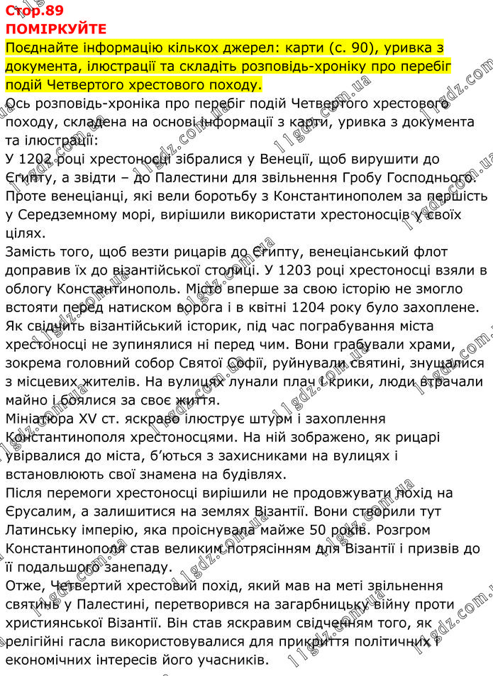 ПОМІРКУЙТЕ Поєднайте інформацію кількох джерел: карти (с. 90), уривка з документа, ілюстрації та складіть розповідь-хроніку про перебіг подій Четвертого хрестового походу. Ось розповідь-хроніка про перебіг подій Четвертого хрестового походу, складена на основі інформації з карти, уривка з документа та ілюстрації: У 1202 році хрестоносці зібралися у Венеції, щоб вирушити до Єгипту, а звідти – до Палестини для звільнення Гробу Господнього. Проте венеціанці, які вели боротьбу з Константинополем за першість у Середземному морі, вирішили використати хрестоносців у своїх цілях. Замість того, щоб везти рицарів до Єгипту, венеціанський флот доправив їх до візантійської столиці. У 1203 році хрестоносці взяли в облогу Константинополь. Місто вперше за свою історію не змогло встояти перед натиском ворога і в квітні 1204 року було захоплене. Як свідчить візантійський історик, під час пограбування міста хрестоносці не зупинялися ні перед чим. Вони грабували храми, зокрема головний собор Святої Софії, руйнували святині, знущалися з місцевих жителів. На вулицях лунали плач і крики, люди втрачали майно і боялися за своє життя. Мініатюра XV ст. яскраво ілюструє штурм і захоплення Константинополя хрестоносцями. На ній зображено, як рицарі увірвалися до міста, б’ються з захисниками на вулицях і встановлюють свої знамена на будівлях. Після перемоги хрестоносці вирішили не продовжувати похід на Єрусалим, а залишитися на землях Візантії. Вони створили тут Латинську імперію, яка проіснувала майже 50 років. Розгром Константинополя став великим потрясінням для Візантії і призвів до її подальшого занепаду. Отже, Четвертий хрестовий похід, який мав на меті звільнення святинь у Палестині, перетворився на загарбницьку війну проти християнської Візантії. Він став яскравим свідченням того, як релігійні гасла використовувалися для прикриття політичних і економічних інтересів його учасників.