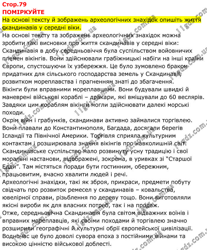 ПОМІРКУЙТЕ На основі тексту й зображень археологічних знахідок опишіть життя скандинавів у середні віки. На основі тексту та зображень археологічних знахідок можна зробити такі висновки про життя скандинавів у середні віки: Скандинавія в добу середньовіччя була суспільством войовничих племен вікінгів. Вони здійснювали грабіжницькі набіги на інші країни Європи, спустошуючи їх узбережжя. Це було зумовлено браком придатних для сільського господарства земель у Скандинавії, розвитком мореплавства і прагненням знаті до збагачення. Вікінги були вправними мореплавцями. Вони будували швидкі й маневрені військові кораблі – дракари, які вміщували до 60 веслярів. Завдяки цим кораблям вікінги могли здійснювати далекі морські походи. Окрім війн і грабунків, скандинави активно займалися торгівлею. Вони плавали до Константинополя, Багдада, досягали берегів Ісландії та Північної Америки. Торгівля сприяла культурним контактам і розширювала знання вікінгів про навколишній світ. Скандинавське суспільство мало розвинуту усну традицію і свої моральні настанови, відображені, зокрема, в уривках зі “Старшої Едди”. Там містяться поради бути гостинним, обережним, працьовитим, вчасно хвалити людей і речі. Археологічні знахідки, такі як зброя, прикраси, предмети побуту свідчать про розвиток ремесел у скандинавів – ковальства, ювелірної справи, різьблення по дереву тощо. Вони виготовляли якісні вироби як для власних потреб, так і на продаж. Отже, середньовічна Скандинавія була світом відважних воїнів і вправних мореплавців, які своїми походами й торгівлею значно розширили географічні й культурні обрії європейської цивілізації. Водночас це було доволі сувора епоха з постійними війнами та високою цінністю військової доблесті.