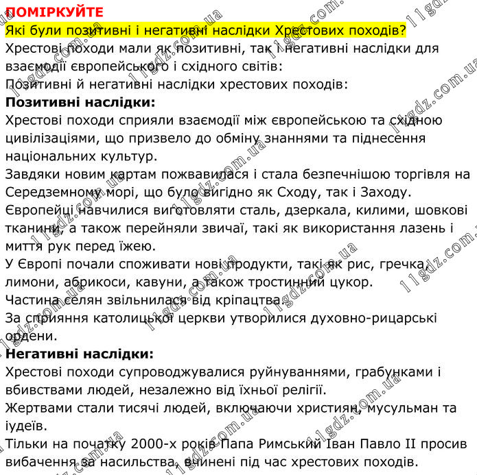 ПОМІРКУЙТЕ Які були позитивні і негативні наслідки Хрестових походів? Хрестові походи мали як позитивні, так і негативні наслідки для взаємодії європейського і східного світів: Позитивні й негативні наслідки хрестових походів: Позитивні наслідки: Хрестові походи сприяли взаємодії між європейською та східною цивілізаціями, що призвело до обміну знаннями та піднесення національних культур. Завдяки новим картам пожвавилася і стала безпечнішою торгівля на Середземному морі, що було вигідно як Сходу, так і Заходу. Європейці навчилися виготовляти сталь, дзеркала, килими, шовкові тканини, а також перейняли звичаї, такі як використання лазень і миття рук перед їжею. У Європі почали споживати нові продукти, такі як рис, гречка, лимони, абрикоси, кавуни, а також тростинний цукор. Частина селян звільнилася від кріпацтва. За сприяння католицької церкви утворилися духовно-рицарські ордени. Негативні наслідки: Хрестові походи супроводжувалися руйнуваннями, грабунками і вбивствами людей, незалежно від їхньої релігії. Жертвами стали тисячі людей, включаючи християн, мусульман та іудеїв. Тільки на початку 2000-х років Папа Римський Іван Павло ІІ просив вибачення за насильства, вчинені під час хрестових походів.