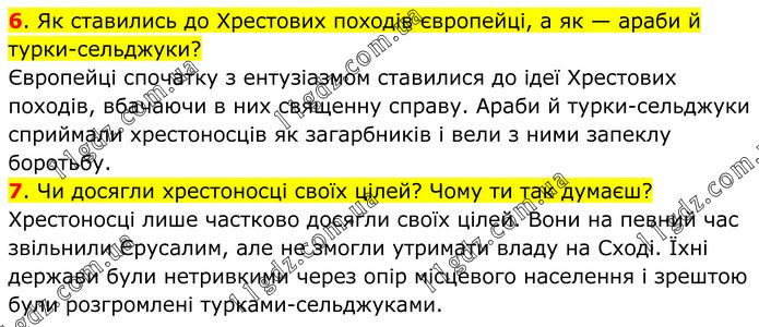 6. Як ставились до Хрестових походів європейці, а як — араби й турки-сельджуки? Європейці спочатку з ентузіазмом ставилися до ідеї Хрестових походів, вбачаючи в них священну справу. Араби й турки-сельджуки сприймали хрестоносців як загарбників і вели з ними запеклу боротьбу. 7. Чи досягли хрестоносці своїх цілей? Чому ти так думаєш? Хрестоносці лише частково досягли своїх цілей. Вони на певний час звільнили Єрусалим, але не змогли утримати владу на Сході. Їхні держави були нетривкими через опір місцевого населення і зрештою були розгромлені турками-сельджуками.