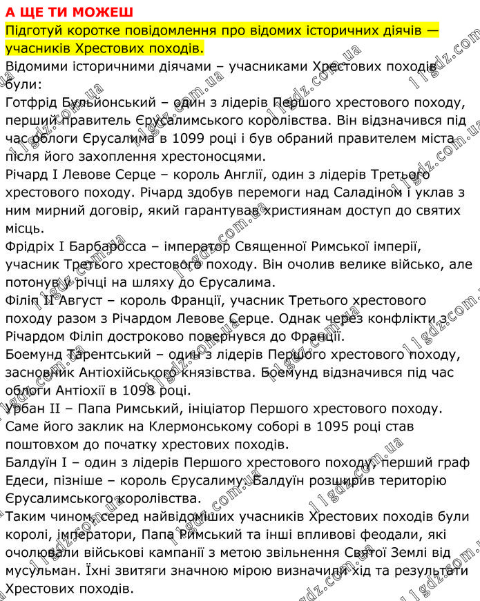 А ЩЕ ТИ МОЖЕШ Підготуй коротке повідомлення про відомих історичних діячів — учасників Хрестових походів. Відомими історичними діячами – учасниками Хрестових походів були: Готфрід Бульйонський – один з лідерів Першого хрестового походу, перший правитель Єрусалимського королівства. Він відзначився під час облоги Єрусалима в 1099 році і був обраний правителем міста після його захоплення хрестоносцями. Річард I Левове Серце – король Англії, один з лідерів Третього хрестового походу. Річард здобув перемоги над Саладіном і уклав з ним мирний договір, який гарантував християнам доступ до святих місць. Фрідріх I Барбаросса – імператор Священної Римської імперії, учасник Третього хрестового походу. Він очолив велике військо, але потонув у річці на шляху до Єрусалима. Філіп II Август – король Франції, учасник Третього хрестового походу разом з Річардом Левове Серце. Однак через конфлікти з Річардом Філіп достроково повернувся до Франції. Боемунд Тарентський – один з лідерів Першого хрестового походу, засновник Антіохійського князівства. Боемунд відзначився під час облоги Антіохії в 1098 році. Урбан II – Папа Римський, ініціатор Першого хрестового походу. Саме його заклик на Клермонському соборі в 1095 році став поштовхом до початку хрестових походів. Балдуїн I – один з лідерів Першого хрестового походу, перший граф Едеси, пізніше – король Єрусалиму. Балдуїн розширив територію Єрусалимського королівства. Таким чином, серед найвідоміших учасників Хрестових походів були королі, імператори, Папа Римський та інші впливові феодали, які очолювали військові кампанії з метою звільнення Святої Землі від мусульман. Їхні звитяги значною мірою визначили хід та результати Хрестових походів.