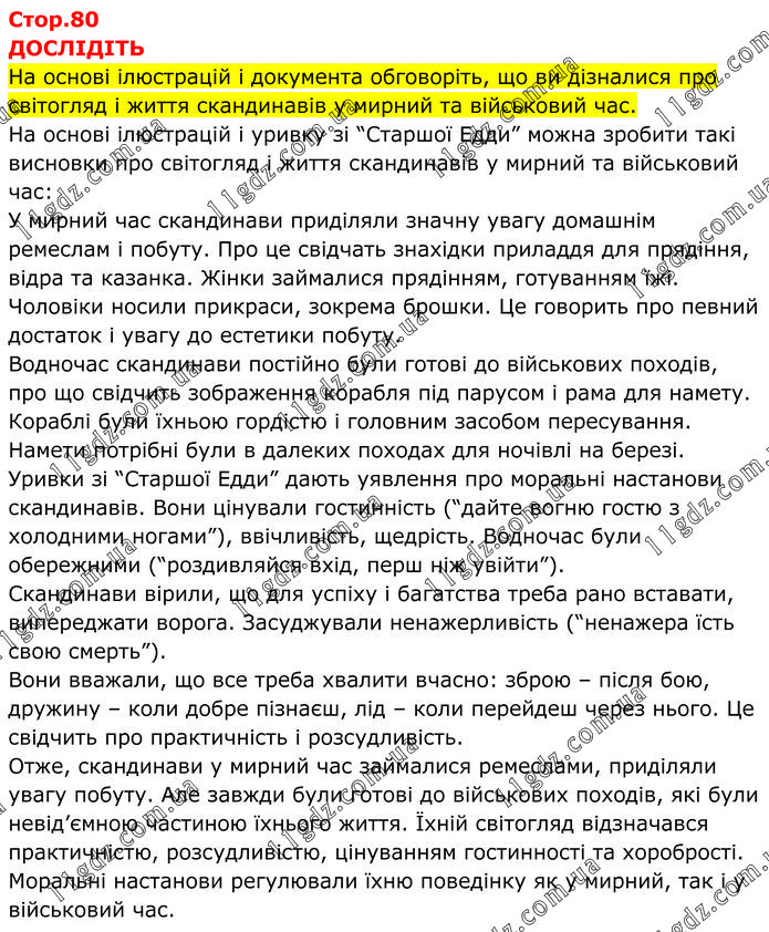 ДОСЛІДІТЬ На основі ілюстрацій і документа обговоріть, що ви дізналися про світогляд і життя скандинавів у мирний та військовий час. На основі ілюстрацій і уривку зі “Старшої Едди” можна зробити такі висновки про світогляд і життя скандинавів у мирний та військовий час: У мирний час скандинави приділяли значну увагу домашнім ремеслам і побуту. Про це свідчать знахідки приладдя для прядіння, відра та казанка. Жінки займалися прядінням, готуванням їжі. Чоловіки носили прикраси, зокрема брошки. Це говорить про певний достаток і увагу до естетики побуту. Водночас скандинави постійно були готові до військових походів, про що свідчить зображення корабля під парусом і рама для намету. Кораблі були їхньою гордістю і головним засобом пересування. Намети потрібні були в далеких походах для ночівлі на березі. Уривки зі “Старшої Едди” дають уявлення про моральні настанови скандинавів. Вони цінували гостинність (“дайте вогню гостю з холодними ногами”), ввічливість, щедрість. Водночас були обережними (“роздивляйся вхід, перш ніж увійти”). Скандинави вірили, що для успіху і багатства треба рано вставати, випереджати ворога. Засуджували ненажерливість (“ненажера їсть свою смерть”). Вони вважали, що все треба хвалити вчасно: зброю – після бою, дружину – коли добре пізнаєш, лід – коли перейдеш через нього. Це свідчить про практичність і розсудливість. Отже, скандинави у мирний час займалися ремеслами, приділяли увагу побуту. Але завжди були готові до військових походів, які були невід’ємною частиною їхнього життя. Їхній світогляд відзначався практичністю, розсудливістю, цінуванням гостинності та хоробрості. Моральні настанови регулювали їхню поведінку як у мирний, так і у військовий час.