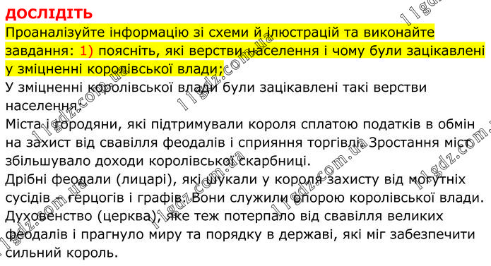 ДОСЛІДІТЬ Проаналізуйте інформацію зі схеми й ілюстрацій та виконайте завдання: 1) поясніть, які верстви населення і чому були зацікавлені у зміцненні королівської влади; У зміцненні королівської влади були зацікавлені такі верстви населення: Міста і городяни, які підтримували короля сплатою податків в обмін на захист від свавілля феодалів і сприяння торгівлі. Зростання міст збільшувало доходи королівської скарбниці. Дрібні феодали (лицарі), які шукали у короля захисту від могутніх сусідів – герцогів і графів. Вони служили опорою королівської влади. Духовенство (церква), яке теж потерпало від свавілля великих феодалів і прагнуло миру та порядку в державі, які міг забезпечити сильний король.