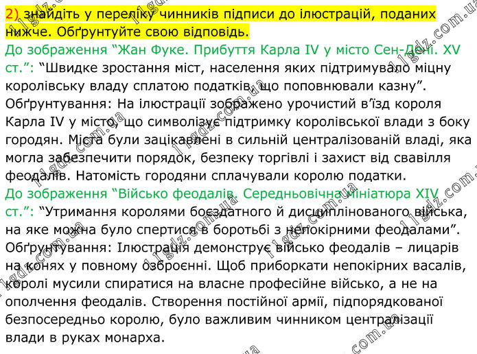 2) знайдіть у переліку чинників підписи до ілюстрацій, поданих нижче. Обґрунтуйте свою відповідь. До зображення “Жан Фуке. Прибуття Карла IV у місто Сен-Дені. XV ст.”: “Швидке зростання міст, населення яких підтримувало міцну королівську владу сплатою податків, що поповнювали казну”. Обґрунтування: На ілюстрації зображено урочистий в’їзд короля Карла IV у місто, що символізує підтримку королівської влади з боку городян. Міста були зацікавлені в сильній централізованій владі, яка могла забезпечити порядок, безпеку торгівлі і захист від свавілля феодалів. Натомість городяни сплачували королю податки. До зображення “Військо феодалів. Середньовічна мініатюра XIV ст.”: “Утримання королями боєздатного й дисциплінованого війська, на яке можна було спертися в боротьбі з непокірними феодалами”. Обґрунтування: Ілюстрація демонструє військо феодалів – лицарів на конях у повному озброєнні. Щоб приборкати непокірних васалів, королі мусили спиратися на власне професійне військо, а не на ополчення феодалів. Створення постійної армії, підпорядкованої безпосередньо королю, було важливим чинником централізації влади в руках монарха.