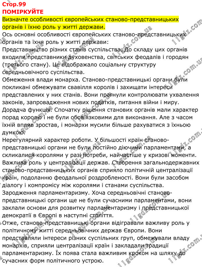 ПОМІРКУЙТЕ Визначте особливості європейських станово-представницьких органів і їхню роль у житті держави. Ось основні особливості європейських станово-представницьких органів та їхня роль у житті держави: Представництво різних станів суспільства. До складу цих органів входили представники духовенства, світських феодалів і городян (третього стану). Це відображало соціальну структуру середньовічного суспільства. Обмеження влади монарха. Станово-представницькі органи були покликані обмежувати свавілля королів і захищати інтереси представлених у них станів. Вони прагнули контролювати ухвалення законів, запровадження нових податків, питання війни і миру. Дорадча функція. Спочатку рішення станових органів мали характер порад королю і не були обов’язковими для виконання. Але з часом їхній вплив зростав, і монархи мусили більше рахуватися з їхньою думкою. Нерегулярний характер роботи. У більшості країн станово-представницькі органи не були постійно діючими парламентами, а скликалися королями у разі потреби, найчастіше у кризові моменти. Важлива роль у централізації держав. Створення загальнодержавних станово-представницьких органів сприяло політичній централізації країн, подоланню феодальної роздробленості. Вони були засобом діалогу і компромісу між королями і станами суспільства. Зародження парламентаризму. Хоча середньовічні станово-представницькі органи ще не були сучасними парламентами, вони заклали основи для розвитку парламентаризму і представницької демократії в Європі в наступні століття. Отже, станово-представницькі органи відігравали важливу роль у політичному житті середньовічних держав Європи. Вони представляли інтереси різних суспільних груп, обмежували владу монархів, сприяли централізації країн і закладали традиції парламентаризму. Їх поява стала важливим кроком на шляху до сучасних форм політичного устрою.