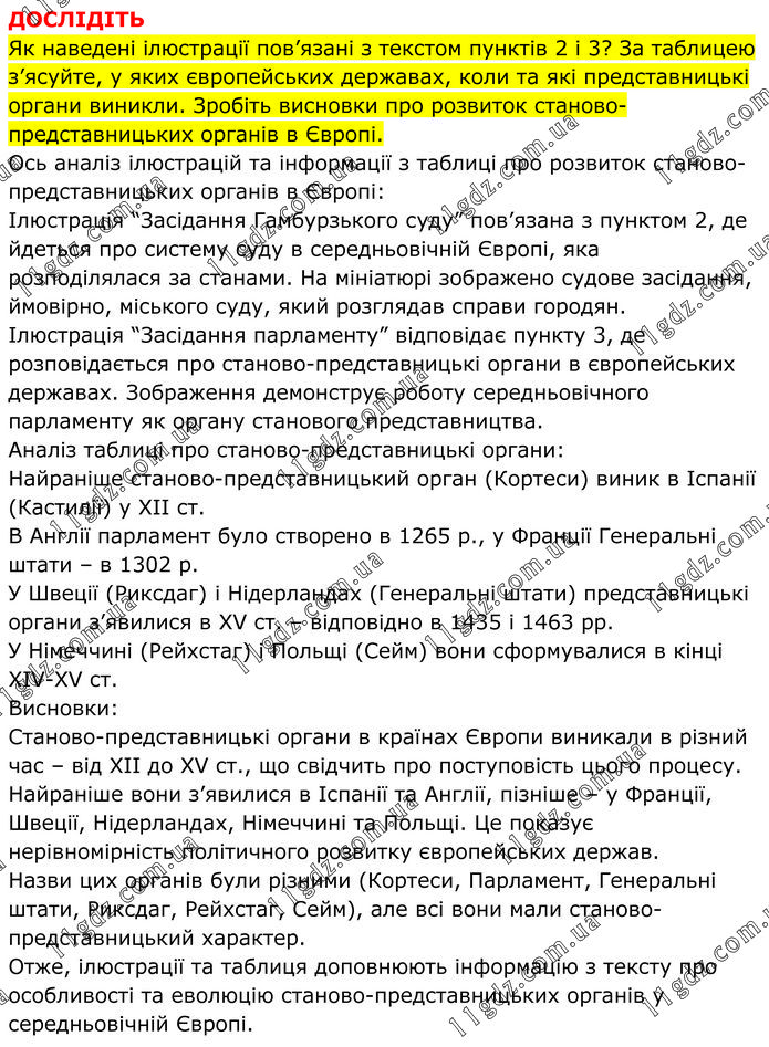 ДОСЛІДІТЬ Як наведені ілюстрації пов’язані з текстом пунктів 2 і 3? За таблицею з’ясуйте, у яких європейських державах, коли та які представницькі органи виникли. Зробіть висновки про розвиток станово-представницьких органів в Європі. Ось аналіз ілюстрацій та інформації з таблиці про розвиток станово-представницьких органів в Європі: Ілюстрація “Засідання Гамбурзького суду” пов’язана з пунктом 2, де йдеться про систему суду в середньовічній Європі, яка розподілялася за станами. На мініатюрі зображено судове засідання, ймовірно, міського суду, який розглядав справи городян. Ілюстрація “Засідання парламенту” відповідає пункту 3, де розповідається про станово-представницькі органи в європейських державах. Зображення демонструє роботу середньовічного парламенту як органу станового представництва. Аналіз таблиці про станово-представницькі органи: Найраніше станово-представницький орган (Кортеси) виник в Іспанії (Кастилії) у XII ст. В Англії парламент було створено в 1265 р., у Франції Генеральні штати – в 1302 р. У Швеції (Риксдаг) і Нідерландах (Генеральні штати) представницькі органи з’явилися в XV ст. – відповідно в 1435 і 1463 рр. У Німеччині (Рейхстаг) і Польщі (Сейм) вони сформувалися в кінці XIV-XV ст. Висновки: Станово-представницькі органи в країнах Європи виникали в різний час – від XII до XV ст., що свідчить про поступовість цього процесу. Найраніше вони з’явилися в Іспанії та Англії, пізніше – у Франції, Швеції, Нідерландах, Німеччині та Польщі. Це показує нерівномірність політичного розвитку європейських держав. Назви цих органів були різними (Кортеси, Парламент, Генеральні штати, Риксдаг, Рейхстаг, Сейм), але всі вони мали станово-представницький характер. Отже, ілюстрації та таблиця доповнюють інформацію з тексту про особливості та еволюцію станово-представницьких органів у середньовічній Європі.