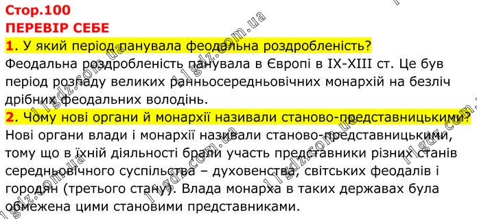 ПЕРЕВІР СЕБЕ 1. У який період панувала феодальна роздробленість? Феодальна роздробленість панувала в Європі в IX-XIII ст. Це був період розпаду великих ранньосередньовічних монархій на безліч дрібних феодальних володінь. 2. Чому нові органи й монархії називали станово-представницькими? Нові органи влади і монархії називали станово-представницькими, тому що в їхній діяльності брали участь представники різних станів середньовічного суспільства – духовенства, світських феодалів і городян (третього стану). Влада монарха в таких державах була обмежена цими становими представниками.
