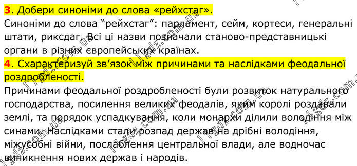 3. Добери синоніми до слова «рейхстаг». Синоніми до слова “рейхстаг”: парламент, сейм, кортеси, генеральні штати, риксдаг. Всі ці назви позначали станово-представницькі органи в різних європейських країнах. 4. Схарактеризуй зв’язок між причинами та наслідками феодальної роздробленості. Причинами феодальної роздробленості були розвиток натурального господарства, посилення великих феодалів, яким королі роздавали землі, та порядок успадкування, коли монархи ділили володіння між синами. Наслідками стали розпад держав на дрібні володіння, міжусобні війни, послаблення центральної влади, але водночас виникнення нових держав і народів.