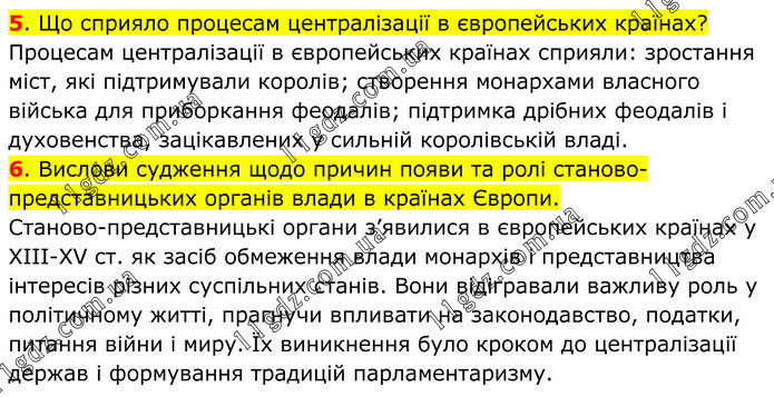 5. Що сприяло процесам централізації в європейських країнах? Процесам централізації в європейських країнах сприяли: зростання міст, які підтримували королів; створення монархами власного війська для приборкання феодалів; підтримка дрібних феодалів і духовенства, зацікавлених у сильній королівській владі. 6. Вислови судження щодо причин появи та ролі станово-представницьких органів влади в країнах Європи. Станово-представницькі органи з’явилися в європейських країнах у XIII-XV ст. як засіб обмеження влади монархів і представництва інтересів різних суспільних станів. Вони відігравали важливу роль у політичному житті, прагнучи впливати на законодавство, податки, питання війни і миру. Їх виникнення було кроком до централізації держав і формування традицій парламентаризму.