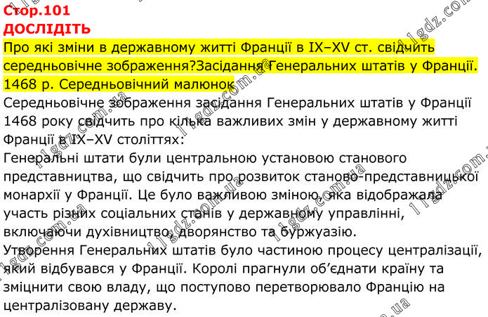 ДОСЛІДІТЬ Про які зміни в державному житті Франції в ІХ–ХV ст. свідчить середньовічне зображення?Засідання Генеральних штатів у Франції. 1468 р. Середньовічний малюнок Середньовічне зображення засідання Генеральних штатів у Франції 1468 року свідчить про кілька важливих змін у державному житті Франції в ІХ–ХV століттях: Генеральні штати були центральною установою станового представництва, що свідчить про розвиток станово-представницької монархії у Франції. Це було важливою зміною, яка відображала участь різних соціальних станів у державному управлінні, включаючи духівництво, дворянство та буржуазію. Утворення Генеральних штатів було частиною процесу централізації, який відбувався у Франції. Королі прагнули об’єднати країну та зміцнити свою владу, що поступово перетворювало Францію на централізовану державу.