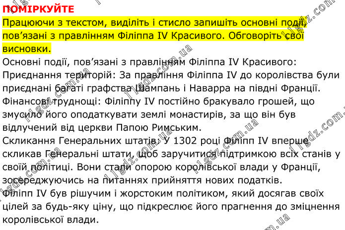 ПОМІРКУЙТЕ Працюючи з текстом, виділіть і стисло запишіть основні події, пов’язані з правлінням Філіппа IV Красивого. Обговоріть свої висновки. Основні події, пов’язані з правлінням Філіппа IV Красивого: Приєднання територій: За правління Філіппа IV до королівства були приєднані багаті графства Шампань і Наварра на півдні Франції. Фінансові труднощі: Філіппу IV постійно бракувало грошей, що змусило його оподаткувати землі монастирів, за що він був відлучений від церкви Папою Римським. Скликання Генеральних штатів: У 1302 році Філіпп IV вперше скликав Генеральні штати, щоб заручитися підтримкою всіх станів у своїй політиці. Вони стали опорою королівської влади у Франції, зосереджуючись на питаннях прийняття нових податків. Філіпп IV був рішучим і жорстоким політиком, який досягав своїх цілей за будь-яку ціну, що підкреслює його прагнення до зміцнення королівської влади.