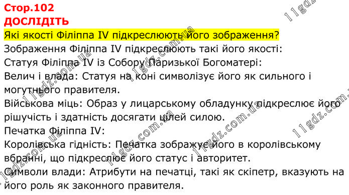 ДОСЛІДІТЬ Які якості Філіппа ІV підкреслюють його зображення? Зображення Філіппа IV підкреслюють такі його якості: Статуя Філіппа IV із Собору Паризької Богоматері: Велич і влада: Статуя на коні символізує його як сильного і могутнього правителя. Військова міць: Образ у лицарському обладунку підкреслює його рішучість і здатність досягати цілей силою. Печатка Філіппа IV: Королівська гідність: Печатка зображує його в королівському вбранні, що підкреслює його статус і авторитет. Символи влади: Атрибути на печатці, такі як скіпетр, вказують на його роль як законного правителя.