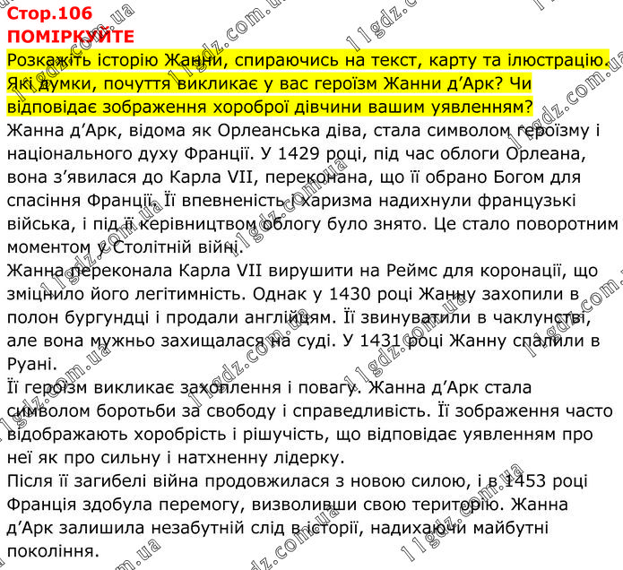 ПОМІРКУЙТЕ Розкажіть історію Жанни, спираючись на текст, карту та ілюстрацію. Які думки, почуття викликає у вас героїзм Жанни д’Арк? Чи відповідає зображення хороброї дівчини вашим уявленням? Жанна д’Арк, відома як Орлеанська діва, стала символом героїзму і національного духу Франції. У 1429 році, під час облоги Орлеана, вона з’явилася до Карла VII, переконана, що її обрано Богом для спасіння Франції. Її впевненість і харизма надихнули французькі війська, і під її керівництвом облогу було знято. Це стало поворотним моментом у Столітній війні. Жанна переконала Карла VII вирушити на Реймс для коронації, що зміцнило його легітимність. Однак у 1430 році Жанну захопили в полон бургундці і продали англійцям. Її звинуватили в чаклунстві, але вона мужньо захищалася на суді. У 1431 році Жанну спалили в Руані. Її героїзм викликає захоплення і повагу. Жанна д’Арк стала символом боротьби за свободу і справедливість. Її зображення часто відображають хоробрість і рішучість, що відповідає уявленням про неї як про сильну і натхненну лідерку. Після її загибелі війна продовжилася з новою силою, і в 1453 році Франція здобула перемогу, визволивши свою територію. Жанна д’Арк залишила незабутній слід в історії, надихаючи майбутні покоління.