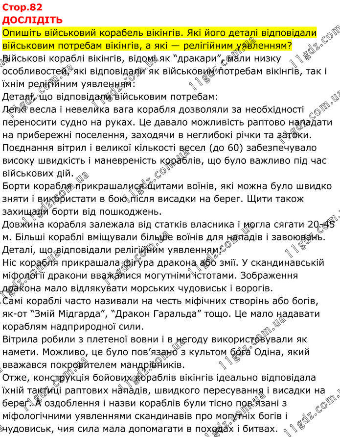 ДОСЛІДІТЬ Опишіть військовий корабель вікінгів. Які його деталі відповідали військовим потребам вікінгів, а які — релігійним уявленням? Військові кораблі вікінгів, відомі як “дракари”, мали низку особливостей, які відповідали як військовим потребам вікінгів, так і їхнім релігійним уявленням: Деталі, що відповідали військовим потребам: Легкі весла і невелика вага корабля дозволяли за необхідності переносити судно на руках. Це давало можливість раптово нападати на прибережні поселення, заходячи в неглибокі річки та затоки. Поєднання вітрил і великої кількості весел (до 60) забезпечувало високу швидкість і маневреність кораблів, що було важливо під час військових дій. Борти корабля прикрашалися щитами воїнів, які можна було швидко зняти і використати в бою після висадки на берег. Щити також захищали борти від пошкоджень. Довжина корабля залежала від статків власника і могла сягати 20-45 м. Більші кораблі вміщували більше воїнів для нападів і завоювань. Деталі, що відповідали релігійним уявленням: Ніс корабля прикрашала фігура дракона або змії. У скандинавській міфології дракони вважалися могутніми істотами. Зображення дракона мало відлякувати морських чудовиськ і ворогів. Самі кораблі часто називали на честь міфічних створінь або богів, як-от “Змій Мідгарда”, “Дракон Гаральда” тощо. Це мало надавати кораблям надприродної сили. Вітрила робили з плетеної вовни і в негоду використовували як намети. Можливо, це було пов’язано з культом бога Одіна, який вважався покровителем мандрівників. Отже, конструкція бойових кораблів вікінгів ідеально відповідала їхній тактиці раптових нападів, швидкого пересування і висадки на берег. А оздоблення і назви кораблів були тісно пов’язані з міфологічними уявленнями скандинавів про могутніх богів і чудовиськ, чия сила мала допомагати в походах і битвах.