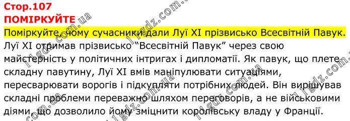 ПОМІРКУЙТЕ Поміркуйте, чому сучасники дали Луї ХІ прізвисько Всесвітній Павук. Луї XI отримав прізвисько “Всесвітній Павук” через свою майстерність у політичних інтригах і дипломатії. Як павук, що плете складну павутину, Луї XI вмів маніпулювати ситуаціями, пересварювати ворогів і підкупляти потрібних людей. Він вирішував складні проблеми переважно шляхом переговорів, а не військовими діями, що дозволило йому зміцнити королівську владу у Франції.