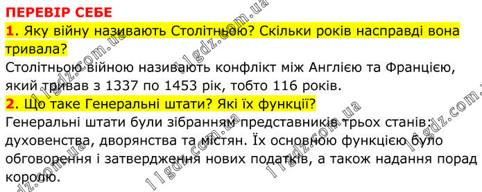 ПЕРЕВІР СЕБЕ 1. Яку війну називають Столітньою? Скільки років насправді вона тривала? Столітньою війною називають конфлікт між Англією та Францією, який тривав з 1337 по 1453 рік, тобто 116 років. 2. Що таке Генеральні штати? Які їх функції? Генеральні штати були зібранням представників трьох станів: духовенства, дворянства та містян. Їх основною функцією було обговорення і затвердження нових податків, а також надання порад королю.