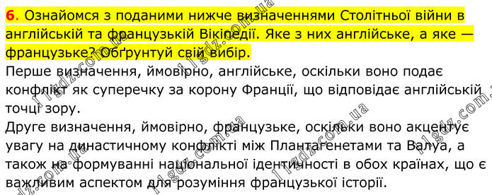 Ознайомся з поданими нижче визначеннями Столітньої війни в англійській та французькій Вікіпедії. Яке з них англійське, а яке — французьке? Обґрунтуй свій вибір. Перше визначення, ймовірно, англійське, оскільки воно подає конфлікт як суперечку за корону Франції, що відповідає англійській точці зору. Друге визначення, ймовірно, французьке, оскільки воно акцентує увагу на династичному конфлікті між Плантагенетами та Валуа, а також на формуванні національної ідентичності в обох країнах, що є важливим аспектом для розуміння французької історії.