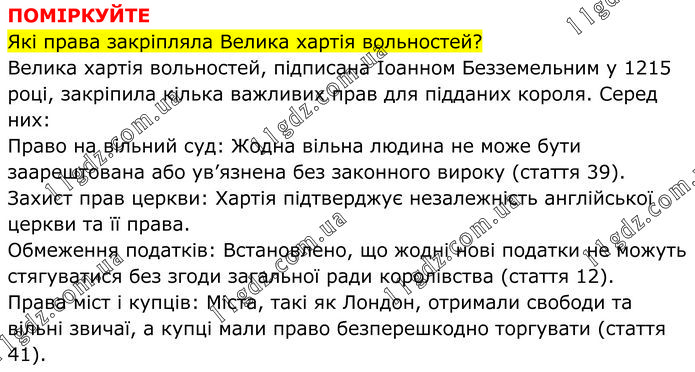 ПОМІРКУЙТЕ Які права закріпляла Велика хартія вольностей? Велика хартія вольностей, підписана Іоанном Безземельним у 1215 році, закріпила кілька важливих прав для підданих короля. Серед них: Право на вільний суд: Жодна вільна людина не може бути заарештована або ув’язнена без законного вироку (стаття 39). Захист прав церкви: Хартія підтверджує незалежність англійської церкви та її права. Обмеження податків: Встановлено, що жодні нові податки не можуть стягуватися без згоди загальної ради королівства (стаття 12). Права міст і купців: Міста, такі як Лондон, отримали свободи та вільні звичаї, а купці мали право безперешкодно торгувати (стаття 41).