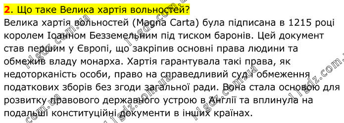 2. Що таке Велика хартія вольностей? Велика хартія вольностей (Magna Carta) була підписана в 1215 році королем Іоанном Безземельним під тиском баронів. Цей документ став першим у Європі, що закріпив основні права людини та обмежив владу монарха. Хартія гарантувала такі права, як недоторканість особи, право на справедливий суд і обмеження податкових зборів без згоди загальної ради. Вона стала основою для розвитку правового державного устрою в Англії та вплинула на подальші конституційні документи в інших країнах.