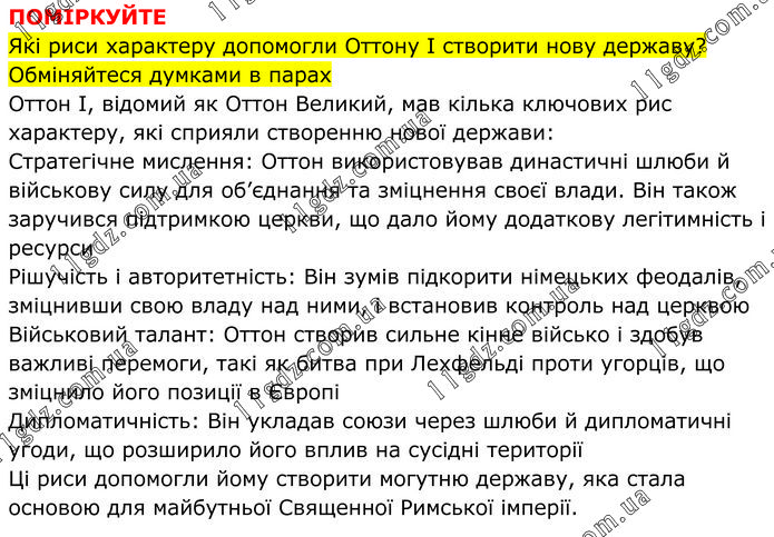 ПОМІРКУЙТЕ Які риси характеру допомогли Оттону І створити нову державу? Обміняйтеся думками в парах Оттон I, відомий як Оттон Великий, мав кілька ключових рис характеру, які сприяли створенню нової держави: Стратегічне мислення: Оттон використовував династичні шлюби й військову силу для об’єднання та зміцнення своєї влади. Він також заручився підтримкою церкви, що дало йому додаткову легітимність і ресурси Рішучість і авторитетність: Він зумів підкорити німецьких феодалів, зміцнивши свою владу над ними, і встановив контроль над церквою Військовий талант: Оттон створив сильне кінне військо і здобув важливі перемоги, такі як битва при Лехфельді проти угорців, що зміцнило його позиції в Європі Дипломатичність: Він укладав союзи через шлюби й дипломатичні угоди, що розширило його вплив на сусідні території Ці риси допомогли йому створити могутню державу, яка стала основою для майбутньої Священної Римської імперії.