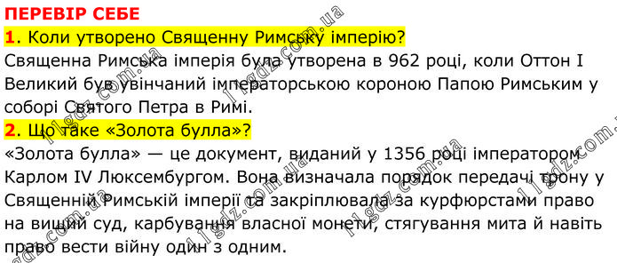 ПЕРЕВІР СЕБЕ 1. Коли утворено Священну Римську імперію? Священна Римська імперія була утворена в 962 році, коли Оттон I Великий був увінчаний імператорською короною Папою Римським у соборі Святого Петра в Римі. 2. Що таке «Золота булла»? «Золота булла» — це документ, виданий у 1356 році імператором Карлом IV Люксембургом. Вона визначала порядок передачі трону у Священній Римській імперії та закріплювала за курфюрстами право на вищий суд, карбування власної монети, стягування мита й навіть право вести війну один з одним.