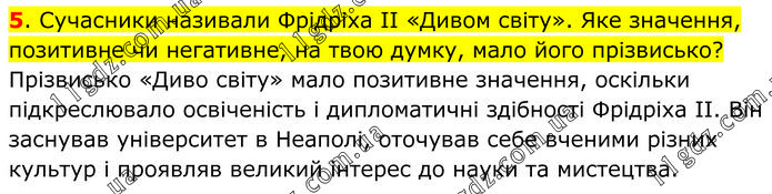 Сучасники називали Фрідріха ІІ «Дивом світу». Яке значення, позитивне чи негативне, на твою думку, мало його прізвисько? Прізвисько «Диво світу» мало позитивне значення, оскільки підкреслювало освіченість і дипломатичні здібності Фрідріха II. Він заснував університет в Неаполі, оточував себе вченими різних культур і проявляв великий інтерес до науки та мистецтва.