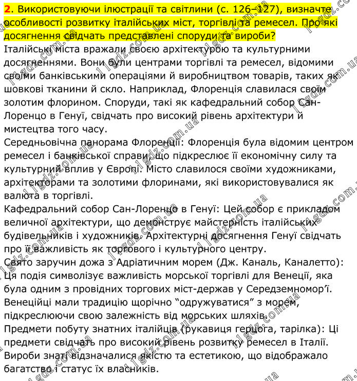 Використовуючи ілюстрації та світлини (с. 126–127), визначте особливості розвитку італійських міст, торгівлі та ремесел. Про які досягнення свідчать представлені споруди та вироби? Італійські міста вражали своєю архітектурою та культурними досягненнями. Вони були центрами торгівлі та ремесел, відомими своїми банківськими операціями й виробництвом товарів, таких як шовкові тканини й скло. Наприклад, Флоренція славилася своїм золотим флорином. Споруди, такі як кафедральний собор Сан-Лоренцо в Генуї, свідчать про високий рівень архітектури й мистецтва того часу. Середньовічна панорама Флоренції: Флоренція була відомим центром ремесел і банківської справи, що підкреслює її економічну силу та культурний вплив у Європі. Місто славилося своїми художниками, архітекторами та золотими флоринами, які використовувалися як валюта в торгівлі. Кафедральний собор Сан-Лоренцо в Генуї: Цей собор є прикладом величної архітектури, що демонструє майстерність італійських будівельників і художників. Архітектурні досягнення Генуї свідчать про її важливість як торгового і культурного центру. Свято заручин дожа з Адріатичним морем (Дж. Каналь, Каналетто): Ця подія символізує важливість морської торгівлі для Венеції, яка була одним з провідних торгових міст-держав у Середземномор’ї. Венеційці мали традицію щорічно “одружуватися” з морем, підкреслюючи свою залежність від морських шляхів. Предмети побуту знатних італійців (рукавиця герцога, тарілка): Ці предмети свідчать про високий рівень розвитку ремесел в Італії. Вироби знаті відзначалися якістю та естетикою, що відображало багатство і статус їх власників.