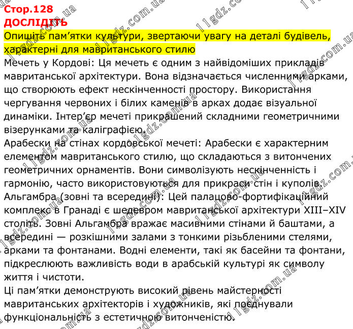 ДОСЛІДІТЬ Опишіть пам’ятки культури, звертаючи увагу на деталі будівель, характерні для мавританського стилю Мечеть у Кордові: Ця мечеть є одним з найвідоміших прикладів мавританської архітектури. Вона відзначається численними арками, що створюють ефект нескінченності простору. Використання чергування червоних і білих каменів в арках додає візуальної динаміки. Інтер’єр мечеті прикрашений складними геометричними візерунками та каліграфією. Арабески на стінах кордовської мечеті: Арабески є характерним елементом мавританського стилю, що складаються з витончених геометричних орнаментів. Вони символізують нескінченність і гармонію, часто використовуються для прикраси стін і куполів. Альгамбра (зовні та всередині): Цей палацово-фортифікаційний комплекс в Гранаді є шедевром мавританської архітектури XIII–XIV століть. Зовні Альгамбра вражає масивними стінами й баштами, а всередині — розкішними залами з тонкими різьбленими стелями, арками та фонтанами. Водні елементи, такі як басейни та фонтани, підкреслюють важливість води в арабській культурі як символу життя і чистоти. Ці пам’ятки демонструють високий рівень майстерності мавританських архітекторів і художників, які поєднували функціональність з естетичною витонченістю.