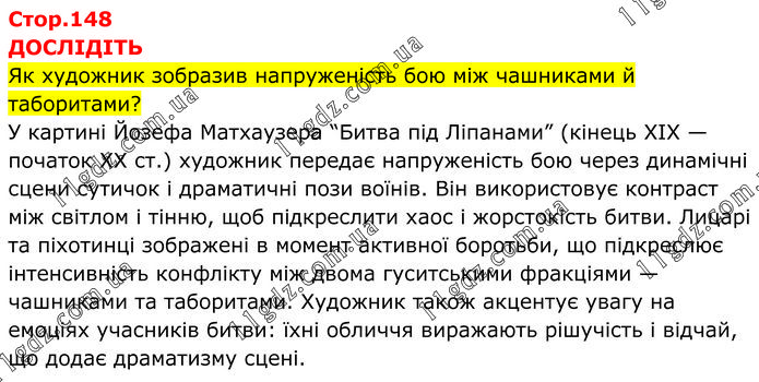 ДОСЛІДІТЬ Як художник зобразив напруженість бою між чашниками й таборитами? У картині Йозефа Матхаузера “Битва під Ліпанами” (кінець XIX — початок XX ст.) художник передає напруженість бою через динамічні сцени сутичок і драматичні пози воїнів. Він використовує контраст між світлом і тінню, щоб підкреслити хаос і жорстокість битви. Лицарі та піхотинці зображені в момент активної боротьби, що підкреслює інтенсивність конфлікту між двома гуситськими фракціями — чашниками та таборитами. Художник також акцентує увагу на емоціях учасників битви: їхні обличчя виражають рішучість і відчай, що додає драматизму сцені.