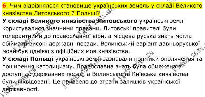 Чим відрізнялося становище українських земель у складі Великого князівства Литовського й Польщі? У складі Великого князівства Литовського українські землі користувалися значними правами. Литовські правителі були толерантними до православної віри, а місцева руська знать могла обіймати високі державні посади. Волинський варіант давньоруської мови був однією з офіційних мов князівства. У складі Польщі українські землі зазнавали політики ополячення та поширення католицизму. Православна знать була обмежена в доступі до державних посад, а Волинське та Київське князівства були ліквідовані. Це призвело до втрати залишків української державності.