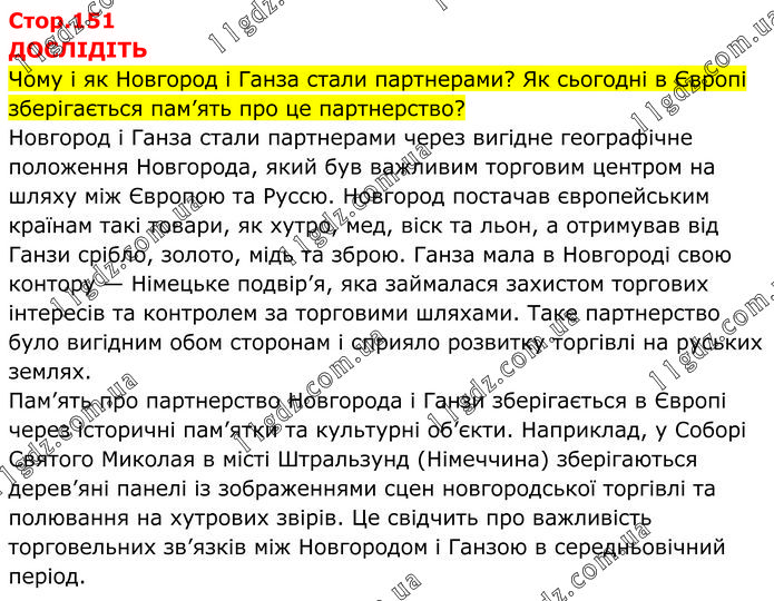 ДОСЛІДІТЬ Чому і як Новгород і Ганза стали партнерами? Як сьогодні в Європі зберігається пам’ять про це партнерство? Новгород і Ганза стали партнерами через вигідне географічне положення Новгорода, який був важливим торговим центром на шляху між Європою та Руссю. Новгород постачав європейським країнам такі товари, як хутро, мед, віск та льон, а отримував від Ганзи срібло, золото, мідь та зброю. Ганза мала в Новгороді свою контору — Німецьке подвір’я, яка займалася захистом торгових інтересів та контролем за торговими шляхами. Таке партнерство було вигідним обом сторонам і сприяло розвитку торгівлі на руських землях. Пам’ять про партнерство Новгорода і Ганзи зберігається в Європі через історичні пам’ятки та культурні об’єкти. Наприклад, у Соборі Святого Миколая в місті Штральзунд (Німеччина) зберігаються дерев’яні панелі із зображеннями сцен новгородської торгівлі та полювання на хутрових звірів. Це свідчить про важливість торговельних зв’язків між Новгородом і Ганзою в середньовічний період.