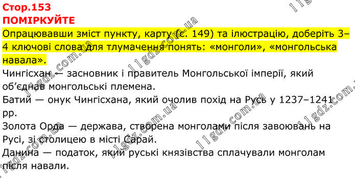 ПОМІРКУЙТЕ Опрацювавши зміст пункту, карту (с. 149) та ілюстрацію, доберіть 3–4 ключові слова для тлумачення понять: «монголи», «монгольська навала». Чингісхан — засновник і правитель Монгольської імперії, який об’єднав монгольські племена. Батий — онук Чингісхана, який очолив похід на Русь у 1237–1241 рр. Золота Орда — держава, створена монголами після завоювань на Русі, зі столицею в місті Сарай. Данина — податок, який руські князівства сплачували монголам після навали.