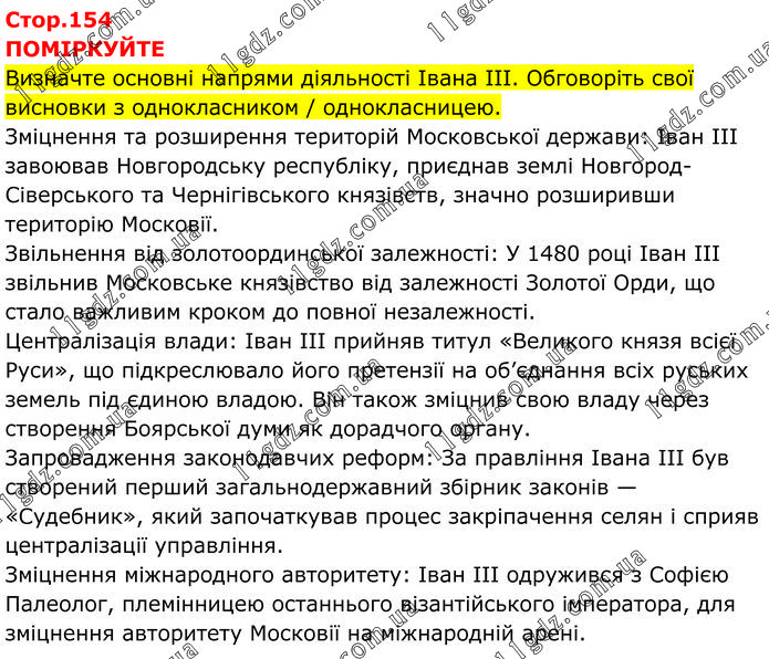 ПОМІРКУЙТЕ Визначте основні напрями діяльності Івана III. Обговоріть свої висновки з однокласником / однокласницею. Зміцнення та розширення територій Московської держави: Іван III завоював Новгородську республіку, приєднав землі Новгород-Сіверського та Чернігівського князівств, значно розширивши територію Московії. Звільнення від золотоординської залежності: У 1480 році Іван III звільнив Московське князівство від залежності Золотої Орди, що стало важливим кроком до повної незалежності. Централізація влади: Іван III прийняв титул «Великого князя всієї Руси», що підкреслювало його претензії на об’єднання всіх руських земель під єдиною владою. Він також зміцнив свою владу через створення Боярської думи як дорадчого органу. Запровадження законодавчих реформ: За правління Івана III був створений перший загальнодержавний збірник законів — «Судебник», який започаткував процес закріпачення селян і сприяв централізації управління. Зміцнення міжнародного авторитету: Іван III одружився з Софією Палеолог, племінницею останнього візантійського імператора, для зміцнення авторитету Московії на міжнародній арені.