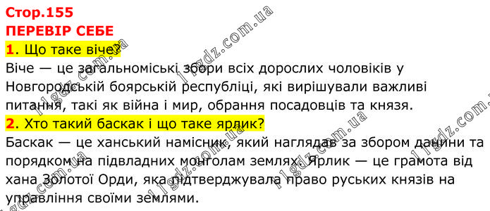 ПЕРЕВІР СЕБЕ 1. Що таке віче? Віче — це загальноміські збори всіх дорослих чоловіків у Новгородській боярській республіці, які вирішували важливі питання, такі як війна і мир, обрання посадовців та князя. 2. Хто такий баскак і що таке ярлик? Баскак — це ханський намісник, який наглядав за збором данини та порядком на підвладних монголам землях. Ярлик — це грамота від хана Золотої Орди, яка підтверджувала право руських князів на управління своїми землями.