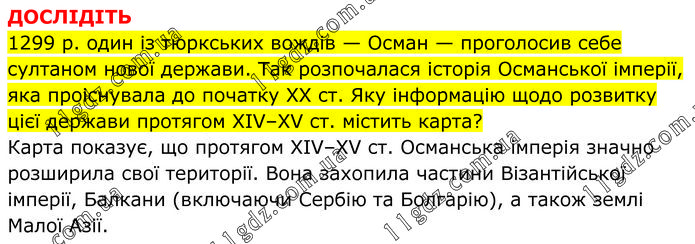 ДОСЛІДІТЬ 1299 р. один із тюркських вождів — Осман — проголосив себе султаном нової держави. Так розпочалася історія Османської імперії, яка проіснувала до початку XX ст. Яку інформацію щодо розвитку цієї держави протягом ХІV–ХV ст. містить карта? Карта показує, що протягом XIV–XV ст. Османська імперія значно розширила свої території. Вона захопила частини Візантійської імперії, Балкани (включаючи Сербію та Болгарію), а також землі Малої Азії.