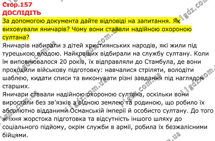 ДОСЛІДІТЬ За допомогою документа дайте відповіді на запитання. Як виховували яничарів? Чому вони ставали надійною охороною султана? Яничарів набирали з дітей християнських народів, які жили під турецькою владою. Найкращих відбирали на службу султану. Коли їм виповнювалося 20 років, їх відправляли до Стамбула, де вони проходили військову підготовку: навчалися стріляти, володіти шаблею, кидати списи та виконувати різні завдання під наглядом старших. Яничари ставали надійною охороною султана, оскільки вони виростали без зв’язків з рідною землею та родиною, що робило їх абсолютно відданими Османській імперії й особисто султану. До того ж їхня жорстока підготовка та відсутність іншого шляху до соціального підйому, окрім служби в армії, робила їх безжалісними бійцями.