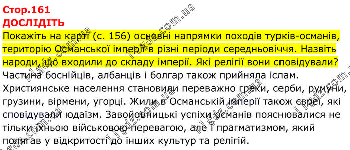ДОСЛІДІТЬ Покажіть на карті (с. 156) основні напрямки походів турків-османів, територію Османської імперії в різні періоди середньовіччя. Назвіть народи, що входили до складу імперії. Які релігії вони сповідували? Частина боснійців, албанців і болгар також прийняла іслам. Християнське населення становили переважно греки, серби, румуни, грузини, вірмени, угорці. Жили в Османській імперії також євреї, які сповідували юдаїзм. Завойовницькі успіхи османів пояснювалися не тільки їхньою військовою перевагою, але і прагматизмом, який полягав у відкритості до інших культур та релігій.