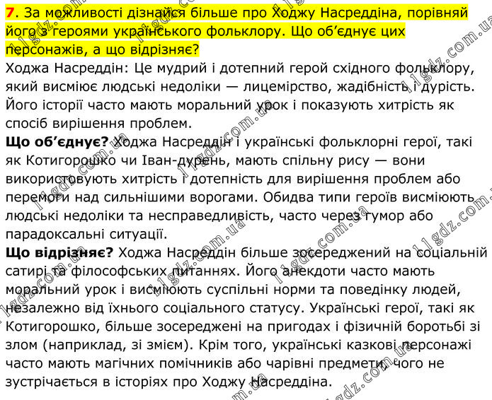 За можливості дізнайся більше про Ходжу Насреддіна, порівняй його з героями українського фольклору. Що об’єднує цих персонажів, а що відрізняє? Ходжа Насреддін: Це мудрий і дотепний герой східного фольклору, який висміює людські недоліки — лицемірство, жадібність і дурість. Його історії часто мають моральний урок і показують хитрість як спосіб вирішення проблем. Що об’єднує? Ходжа Насреддін і українські фольклорні герої, такі як Котигорошко чи Іван-дурень, мають спільну рису — вони використовують хитрість і дотепність для вирішення проблем або перемоги над сильнішими ворогами. Обидва типи героїв висміюють людські недоліки та несправедливість, часто через гумор або парадоксальні ситуації. Що відрізняє? Ходжа Насреддін більше зосереджений на соціальній сатирі та філософських питаннях. Його анекдоти часто мають моральний урок і висміюють суспільні норми та поведінку людей, незалежно від їхнього соціального статусу. Українські герої, такі як Котигорошко, більше зосереджені на пригодах і фізичній боротьбі зі злом (наприклад, зі змієм). Крім того, українські казкові персонажі часто мають магічних помічників або чарівні предмети, чого не зустрічається в історіях про Ходжу Насреддіна.